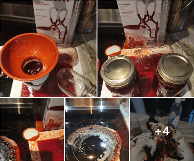 What an awful mess. I cannot believe how much of a mess it made! I finished boiling the fruit and then starting bottling. I thought, at the time, that I should just finish MAKING the jam before cleaning up my mess.
