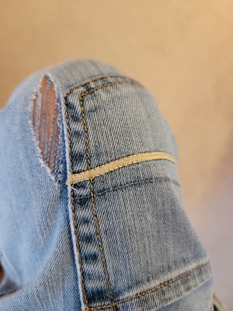 Since I knew I would be on the floor, climbing to reach shelves in my walk-in storage closet and moving dusty boxes from room to room, I wore my favorite, worn in, most comfortable jeans. They are torn at the knee (on purpose) and I LOVE them. They are soft and worn and totally comfortable.