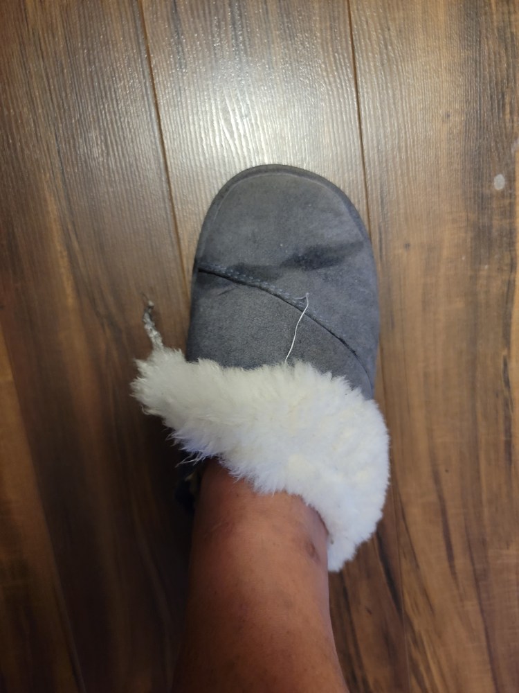 Wearing the slippers that have become Clark’s favorite toy!
